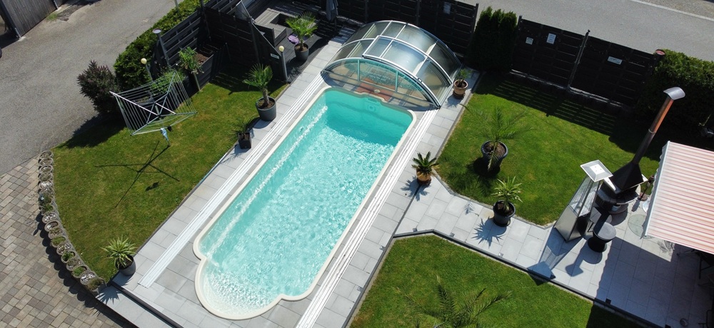 • Das Betreten des Pools ist bei geschlossener Abdeckung durch das öffnen der Schiebetür auf der rechten Seite jederzeit möglich.